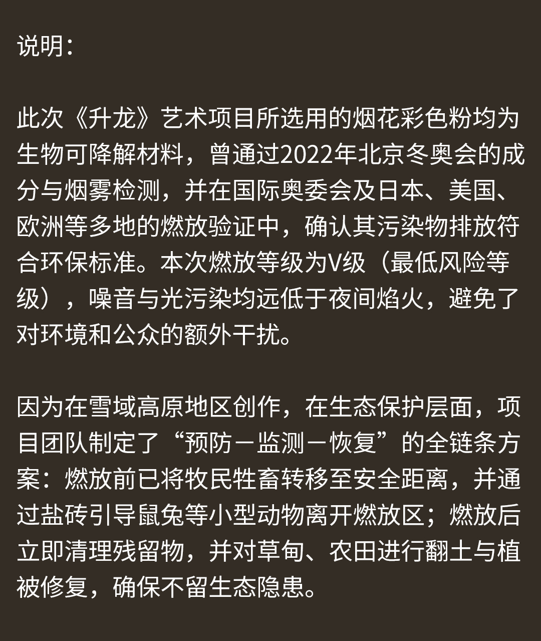 官方声明,该活动使用的是生物可降解材料;燃放前用盐砖引导鼠兔等小型动物离开燃放区;燃放后对山体进行翻土与植被修复。